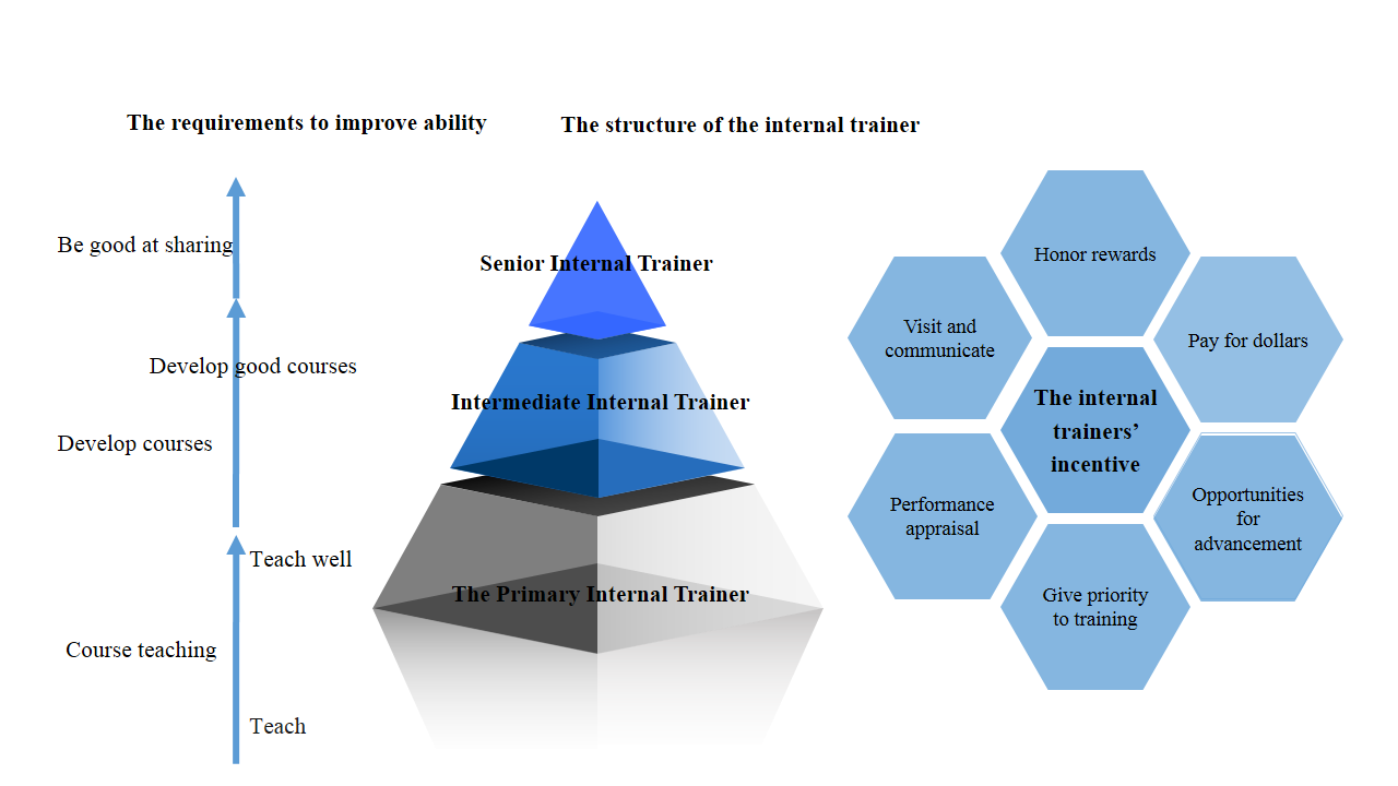 Because of the current situation of "the engineering contradiction" and "the performance-first”, the incentive of the internal trainer team is often the difficulty of the management of the entreprise internal trainers. How to systematically manage the team of internal trainers is the problem of training managers at all levels. Incentive for the internal trainer can be carried out from two aspects: (1) system incentives: the company's system incentive can provide internal training division "solid" commitment, such as hierarchical promotion, class fees; (2) spiritual inspiring: internal trainers’ sense of accomplishment, and the degree of being noticed is also very important factors in the internal training division team.