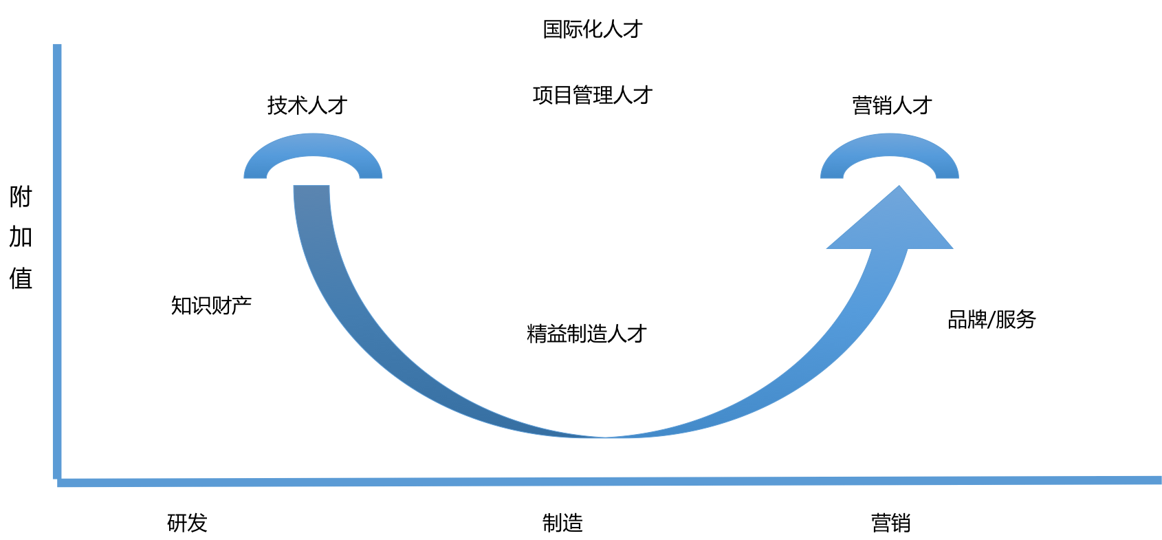 在全球市场化的背景下,企业竞争日益激烈,具备核心技术的专业人员成为企业核心竞争力之一。著名企业家提出的“微笑曲线价值理论”认为:企业在全球产业链运营过程中,附加值更多体现在两端—研发和营销,处于中间环节的制造附加值最低。为占据全球竞争的有利位置,企业人力资源配置也要向“微笑曲线”两端倾斜,应更加注重技术、营销、项目管理、国际化等专业人才的培养。