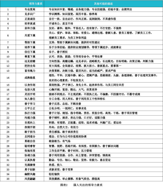 我将调研结果归纳为了以下35条(见图表2)。需要说明的是,这35条没有按高层、中层和基层领导区分。因为企业规模不同,发展阶段不同,对领导力的要求也是不同的。比如,一个中小型公司的中层,对其领导力的要求可能只相当于一个大企业的基层。但对不同层级的领导力的素质要求,也是有规律可循的,结果会在第三项调研结果中呈现。