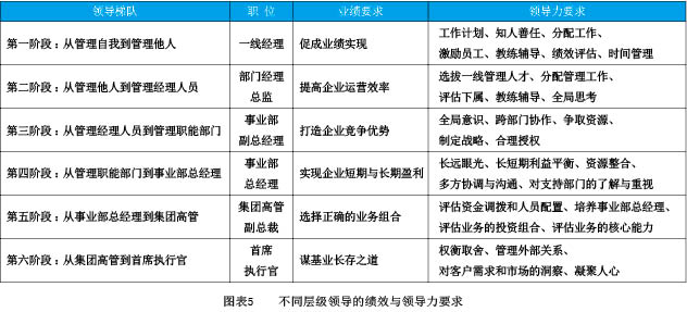 图表5是我根据《业绩梯队》和《领导梯队》两书整理的各层级领导的绩效要求和相对应的领导力素质要求,供大家在建立本组织领导梯队培养体系时参考。