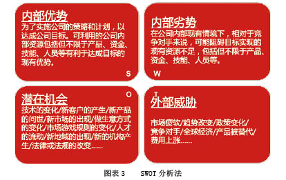 优势(Strength)和劣势(Weakness)是组织的内部因素,可以从管理、组织机构、客户基础、财务状况、研究与开发、运作、市场及营销、发货及商务等维度对项目进行分析;机会(Opportunity)和威胁(Threat)则是从组织的外部因素进行分析,包括超出可控制范围内的力量、问题、趋势和事件等(见图表3)。