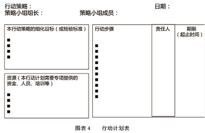 首先,将项目成员分成小组,由小组“领养孩子”,“孩子”是指团队共创过程中产生的各个行动策略,形成行动策略小组,负责各个策略,学员可主动要求成为某个行动策略的行动学习小组的组长;其次是“制定计划”,每个小组根据计划模板制定行动方案;最后,将各行动策略汇总成完整的行动计划(见图表4)。