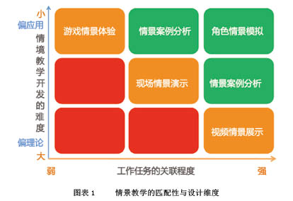 对于不同知识内容的情境教学,匹配性与设计的难度都有所不同:教学内容与工作任务的关联程度等同于工作事件与知识的相关度;知识内容也分为偏理论和偏应用性的,偏应用的内容常以活动的形式出现在课堂教学中,因此它对于教学情景的开发相对简单(见图表1)。