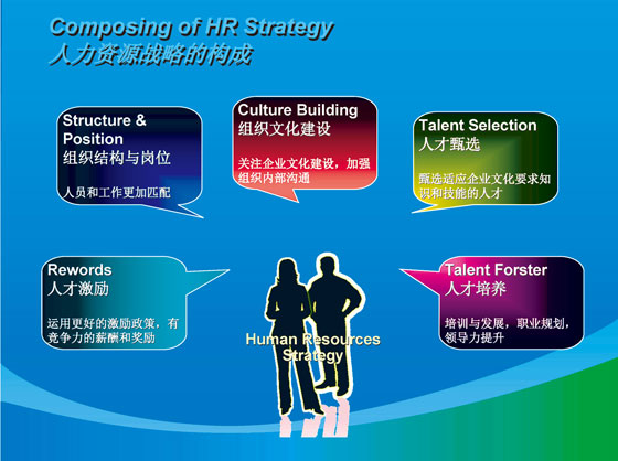 人力资源战略作为一种重要的职能战略受组织的发展战略支配,并反作用于组织发展战略,不同的组织发展战略对人力资源战略的需求亦不相同。组织的人力资源管理战略是紧贴企业的发展战略、并在其基础上规划出来的,与组织自身的经营策略和发展态势紧密相关。我们知道,由于组织所处的行业与所处的发展阶段有所区别,每个企业现阶段的组织战略也是不一样的。即便是在一个行业和同样的阶段,因为它们的发展方向和市场关注重点以及组织自身的特点与文化(核心价值观)不尽相同,它们的发展战略也存在着一定的差异。然而任何的人力资源战略规划都有一个共同点——无论它们置身于什么样的组织、什么样的业务领域,处于什么发展阶段,都是“基于组织绩效的提升与组织能力的发展”(Base on OE promotion and OC improvement),也就是将人员配置(People Positioning)、绩效管理(Performance Management)、培训与开发(Training & Development)、组织结构(Organizational Structure)以及组织和员工沟通(Internal Communications)等人力资源管理功能,与组织共同的业务焦点和方向有效地整合起来的过程,如此一来就使得人力资源管理能够最大化地发挥其对组织绩效的影响。目前这个理念在主流跨国企业的人力资源管理战略体系中比较盛行。参考成功企业的人力资源管理实践,我们可以粗略了解一下人力资源管理战略的框架和构建过程:企业根据目前的商业市场环境与发展趋势(Business Situation & Trend)制定出相应的业务发展战略(Company Business Strategy),同时二者又提出相应的对组织能力(Organization Capability)的要求,再由其制定出相应的人力资源管理战略(HRM Strategy)。
